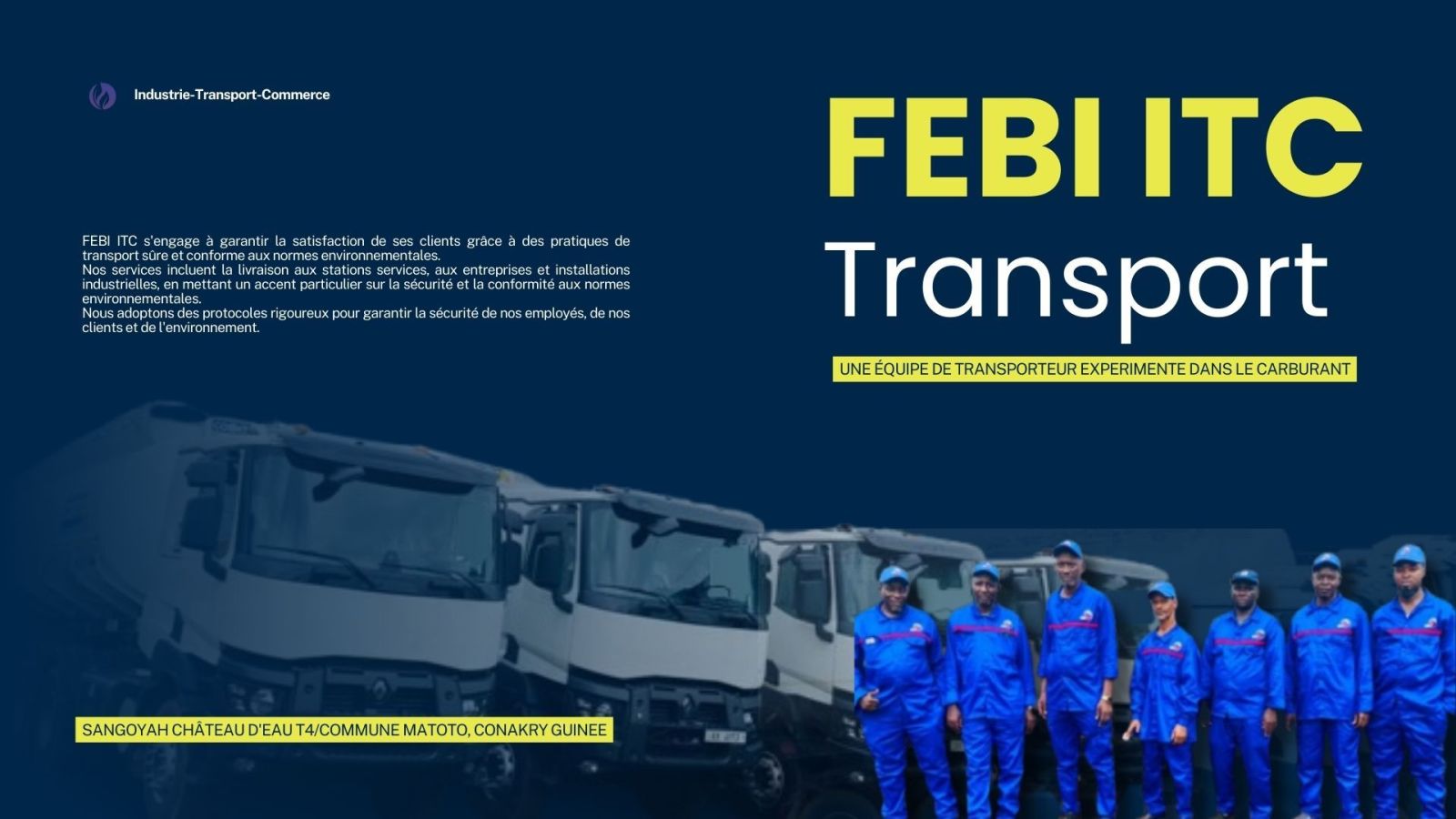 FEBI-ITC est une entreprise innovante et diversifiée de droits guinéens, spécialisée dans l'industrie bio, les lubrifiants pour machine, le transport de carburant et les activités commerciales. Fondée en 2010 pour apporter une solution répondant aux besoins spécifiques du marché guinéen tout en extériorisant celle-ci dans toute l’Afrique, dans le contexte où ces secteurs sont dominés par quelques grands groupes internationaux en guinée. C’est ainsi que febi-itc a vu jour, avec pour ambition de marquer une nouvelle atmosphère dans ces secteurs en offrant un service de proximité inégalé. Aujourd’hui elle fait partir des mastodontes guinéens qui se partagent la part de marché dans ces secteurs